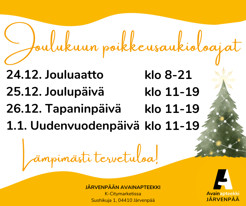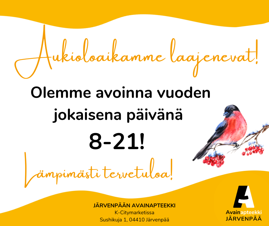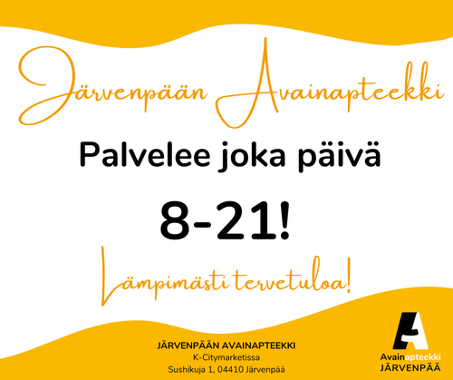 Järvenpään Avainapteekki on osa maanlaajuista Avainapteekki-verkostoa. Liittymällä Avainasiakkaaksi kerrytät rahanarvoista Avainbonusta kaikilla reseptivapailla ostoksilla. Lisäksi Avainapteekit tarjoavat kanta-asiakkailleen tarjouksia joka kuukausi. Ostostietosi tallentuvat asiakasrekisteriimme, mikä parantaa lääkehoidon turvallisuutta.